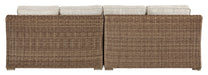 | Details | Includes left-arm facing loveseat, right-arm facing loveseat and 4 throw pillows, "Left-arm" and "right-arm" describe the position of the arm when you face the piece, For indoor or outdoor use, All-weather resin wicker handwoven over powder coated rust-proof aluminum frames, Cushions and pillows covered in high-performing Nuvella™ fabric, All-weather foam cushion core wrapped in soft polyester, Clean fabric with mild soap and water, let air dry; for stubborn stains, use a solution of 4 oz. bleach to 28 oz. water, Imported fabric and fill, Assembly required | |
