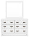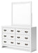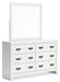 | Details | B427B4: Includes full panel headboard, footboard, rails and slats, Made with hardwood solids, okoume veneer and MDF substrates, White finish, Foundation/box spring required, sold separately, Mattress available, sold separately, Assembly required, B427B1: Includes dresser and mirror, Made with hardwood solids, okoume veneer and MDF substrates, White finish, 6 drawers with dovetail construction and metal center guides, Hardware with dark finish, Drawer interiors are lined with a wood grain laminate for a clean, finished look, Mirror attaches to back of dresser, | |