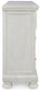 Elegant, timeless furnishings take your bedroom to the next level. Nothing does that better than this dresser. The antiqued white finish with a wonderful grain texture radiates sophistication, while the dark bronze-tone hardware adds an ornate touch. A hidden pull-out tray behind the top middle drawer puts your small valuables out of sight. Felt-finished top drawers round out the piece for the ultimate tasteful bedroom.